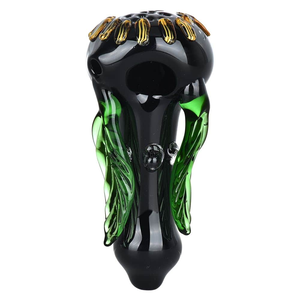 “Light up your life with this Sunflower Glass Hand Pipe – it’s sure to make your flower bloom! With a perfect 4.5 inches, it’s the ideal size for a smooth, enjoyable smoke sesh. Plus, the stunning sunflower design will add a touch of whimsy to your smoke sessions. Trust us, this pipe is the bee’s knees (or should we say, the bee’s petals?).”